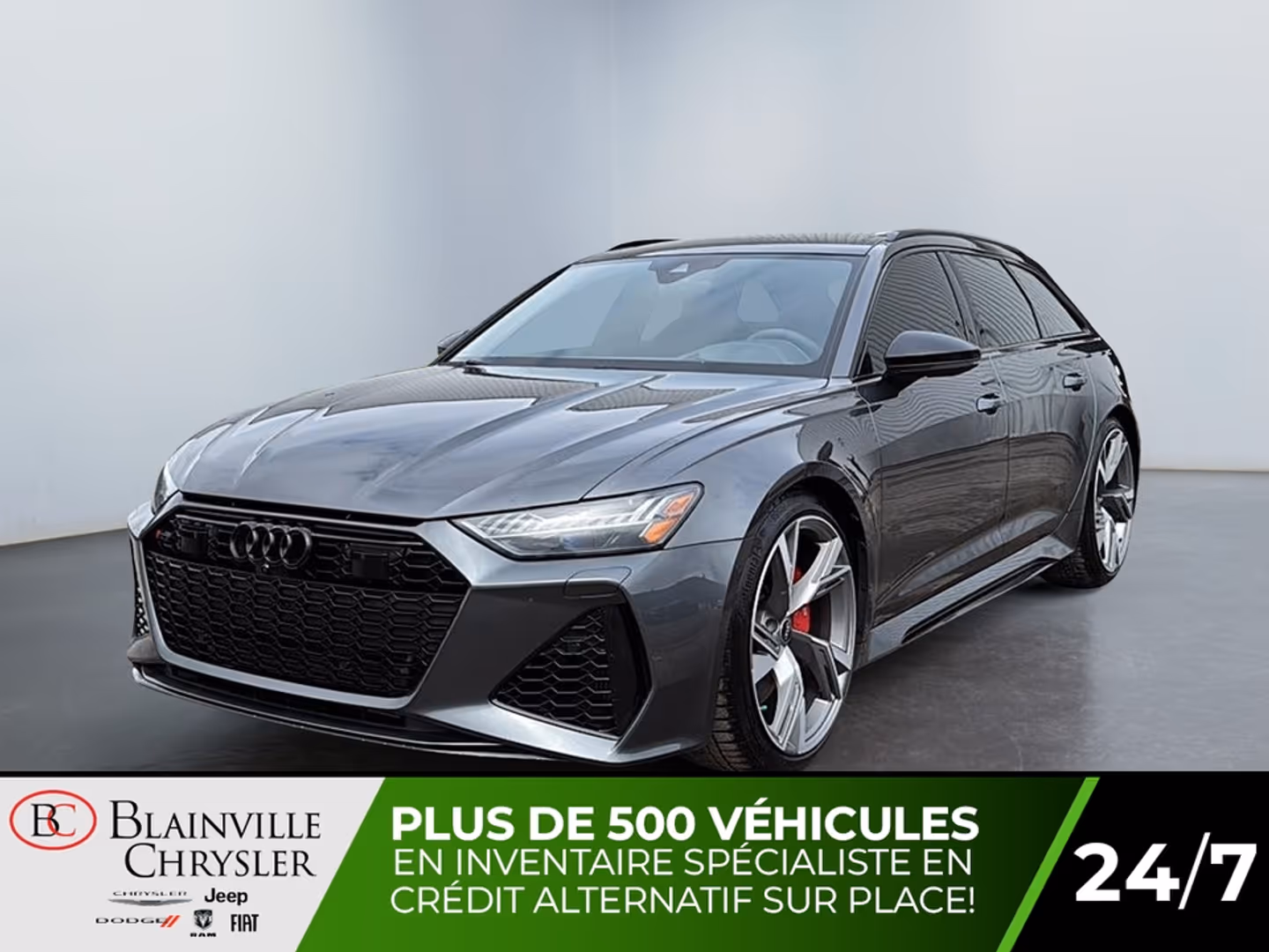 2022 AUDI RS 6 AVANTCARACTÉRISTIQUES PRINCIPALES• Moteur V8 biturbo 4.0 L TFSI avec technologie hybride léger• Environ 591 chevaux et 590 lb-pi de couple• Transmission automatique Tiptronic 8 vitesses• Traction intégrale Audi quattro AWD• Accélération environ 0-100 km/h en ±36 secondes• Familiale haute performance avec habitacle luxueux pour 5 passagersÉQUIPEMENTS DISTINCTIFS• Système multimédia Audi MMI Touch Response avec double écran• Apple CarPlay et Android Auto• Tableau de bord numérique Audi Virtual Cockpit• Sièges sport RS chauffants en cuir Nappa• Volant sport RS multifonction à méplat• Climatisation automatique quatre zones• Toit panoramique• Phares Matrix DEL avec signature Audi• Jantes Audi Sport haute performance• Suspension pneumatique adaptative RS• Audi Drive Select avec modes de conduite RS• Caméra 360° avec capteurs de stationnement• Régulateur de vitesse adaptatif• Alerte d’angle mort et aide au maintien de voieACHETER EN TOUTE CONFIANCE CHEZ BLAINVILLE CHRYSLER• Inspection complète par nos techniciens certifiés• Financement disponible sur place• Garantie prolongée disponible• Échange accepté• Jusqu’à 90 jours sans paiements (selon admissibilité)Disponible dès aujourd’hui chez Blainville Chrysler.Les tarifs et informations présents sur notre site blainvillechrysler.ca sont à jour et prioritaires.Les prix affichés sur des sites externes peuvent être sujets à un délai de mise à jour et ne constituent pas un engagement contractuel.Nous sommes ouverts les samedisTout type de financement possible aucun cas de refusNous parlons anglais aussi2022 AUDI RS 6 AVANTKEY FEATURES• 4.0L TFSI twin-turbocharged V8 engine with mild hybrid technology• Approximately 591 horsepower and 590 lb-ft of torque• 8-speed Tiptronic automatic transmission• Audi quattro all-wheel drive system (AWD)• 0-100 km/h acceleration in approximately 3.6 seconds• High-performance luxury wagon with seating for 5 passengersDISTINCTIVE EQUIPMENT• Audi MMI Touch Response multimedia system with dual screens• Apple CarPlay and Android Auto• Audi Virtual Cockpit digital instrument cluster• Heated RS Nappa leather sport seats• Flat-bottom RS multifunction sport steering wheel• Four-zone automatic climate control• Panoramic roof• Matrix LED headlights with Audi signature lighting• Audi Sport performance alloy wheels• RS adaptive air suspension• Audi Drive Select with RS driving modes• 360° camera with parking sensors• Adaptive cruise control• Blind spot monitoring and lane keeping assistBUY WITH CONFIDENCE AT BLAINVILLE CHRYSLER• Full inspection by our certified technicians• Financing available on site• Extended warranty available• Trade-ins accepted• Up to 90 days with no payments (on approved credit)Available today at Blainville Chrysler.The prices and information on our website blainvillechrysler.ca are up to date and take priority.Prices displayed on external websites may be subject to update delays and do not constitute a contractual commitment.We are open on SaturdaysAll types of financing available no cases refusedWe also speak English
