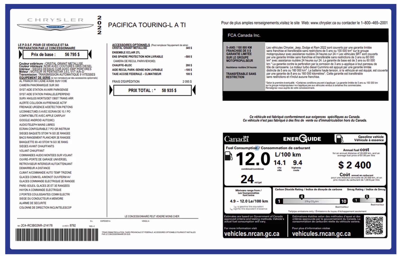 2022 Chrysler Pacifica Touring L AWDBlainville ChryslerJamais accidenté1 propriétaireLa Chrysler Pacifica Touring L 2022 est la minifourgonnette par excellence pour les familles modernes. Offrant un confort haut de gamme une technologie avancée et la traction intégrale (AWD) elle est parfaitement conçue pour affronter les hivers québécois tout en assurant sécurité et élégance.Caractéristiques et options principales :Traction intégrale (AWD) – stabilité et confiance en toute saisonMoteur V6 puissant et performantTransmission automatiqueVersion Touring L bien équipéeSièges en cuirSièges avant chauffantsVolant chauffantPortes latérales électriquesHayon électriqueDémarrage à distanceDémarrage sans clé (bouton-poussoir)Écran tactile avec système UconnectApple CarPlay et Android AutoCaméra de reculBluetooth et ports USBClimatisation multizoneRégulateur de vitesseSystème Stow ’n Go sièges rabattables dans le plancherExcellentes cotes de sécuritéPourquoi choisir cette Pacifica Idéale pour la familleConfort et luxe au quotidienAWD rare et recherchéFiabilité et qualité ChryslerContactez Blainville Chrysler dès aujourd’hui pour plus d’informations ou pour planifier un essai routier !2022 Chrysler Pacifica Touring L AWDBlainville ChryslerThe 2022 Chrysler Pacifica Touring L AWD is the ultimate family minivan offering premium comfort advanced technology and the confidence of All-Wheel Drive. Designed for Canadian winters and everyday convenience it delivers both practicality and refinement.Key Features & Options:All-Wheel Drive (AWD) for superior all-season tractionPowerful and efficient V6 engineAutomatic transmissionTouring L trim levelLeather seatsHeated front seatsHeated steering wheelPower sliding doorsPower liftgateRemote startKeyless entry with push-button startTouchscreen infotainment system with UconnectApple CarPlay & Android AutoRearview cameraBluetooth connectivity & USB portsMulti-zone climate controlCruise controlStow ’n Go seating systemExcellent safety ratingsContact Blainville Chrysler today to schedule a test drive or get more details!