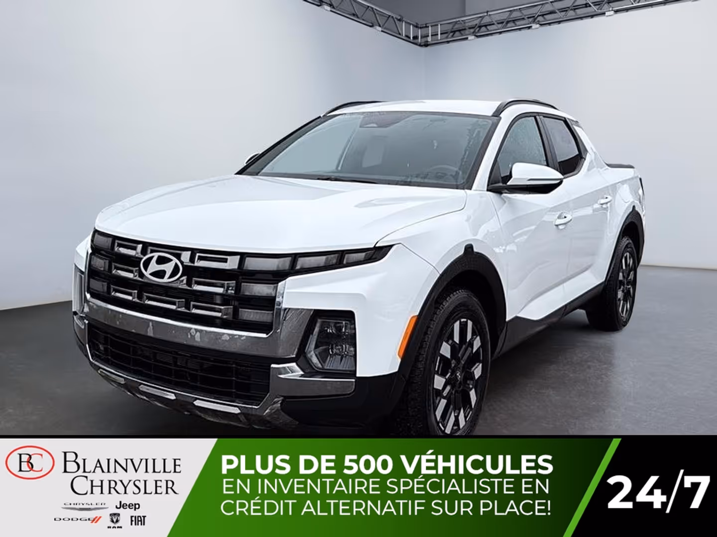 2025 HYUNDAI SANTA CRUZ PREFERREDCARACTÉRISTIQUES PRINCIPALES• Moteur 4 cylindres 2.5 L à injection directe• Environ 191 chevaux et 181 lb-pi de couple• Transmission automatique 8 vitesses SHIFTRONIC• Traction intégrale HTRAC AWD • Capacité de remorquage pouvant atteindre environ 3 500 lb (jusqu’à 5 000 lb avec moteur turbo)• Consommation combinée d’environ 94 L/100 • Camionnette compacte polyvalente avec habitacle confortable pour 5 passagersÉQUIPEMENTS DISTINCTIFS• Système multimédia Hyundai avec écran tactile 123 pouces• Apple CarPlay et Android Auto sans fil• Tableau de bord numérique haute résolution• Sièges chauffants en tissu ou cuir synthétique• Volant multifonction chauffant gainé de cuir• Climatisation automatique• Démarrage à bouton poussoir avec clé intelligente• Caméra de recul avec capteurs de stationnement• Phares DEL avec signature Hyundai• Jantes en alliage• Boîte utilitaire avec compartiment de rangement sous le plancher• Régulateur de vitesse adaptatif• Système de sécurité Hyundai SmartSense• Alerte d’angle mort et aide au maintien de voieACHETER EN TOUTE CONFIANCE CHEZ BLAINVILLE CHRYSLER• Inspection complète par nos techniciens certifiés• Financement disponible sur place• Garantie prolongée disponible• Échange accepté• Jusqu’à 90 jours sans paiements (selon admissibilité)Disponible dès aujourd’hui chez Blainville Chrysler.Les tarifs et informations présents sur notre site blainvillechrysler.ca sont à jour et prioritaires.Les prix affichés sur des sites externes peuvent être sujets à un délai de mise à jour et ne constituent pas un engagement contractuel.Nous sommes ouverts les samedisTout type de financement possible aucun cas de refusNous parlons anglais aussi2025 HYUNDAI SANTA CRUZ PREFERREDKEY FEATURES• 2.5L direct-injection 4-cylinder engine• Approximately 191 horsepower and 181 lb-ft of torque• 8-speed automatic transmission with SHIFTRONIC• HTRAC all-wheel drive (AWD)• Maximum towing capacity of about 3500 lbs (up to 5000 lbs with turbo engine)• Combined fuel economy around 24-25 MPG• Versatile compact pickup with seating for 5 passengersDISTINCTIVE EQUIPMENT• Hyundai infotainment system with 12.3-inch touchscreen display• Wireless Apple CarPlay and Android Auto• Digital driver information display• Heated cloth or leatherette seats• Heated leather multifunction steering wheel• Automatic climate control• Push-button start with smart key• Rear view camera with parking sensors• LED headlights with Hyundai signature lighting• Alloy wheels• Under-bed storage compartment• Adaptive cruise control• Hyundai SmartSense driver-assistance system• Blind spot monitoring and lane keeping assistBUY WITH CONFIDENCE AT BLAINVILLE CHRYSLER• Full inspection by our certified technicians• Financing available on site• Extended warranty available• Trade-ins accepted• Up to 90 days with no payments (on approved credit)Available today at Blainville Chrysler.The prices and information on our website blainvillechrysler.ca are up to date and take priority.Prices displayed on external websites may be subject to update delays and do not constitute a contractual commitment.We are open on SaturdaysAll types of financing available no cases refusedWe also speak English